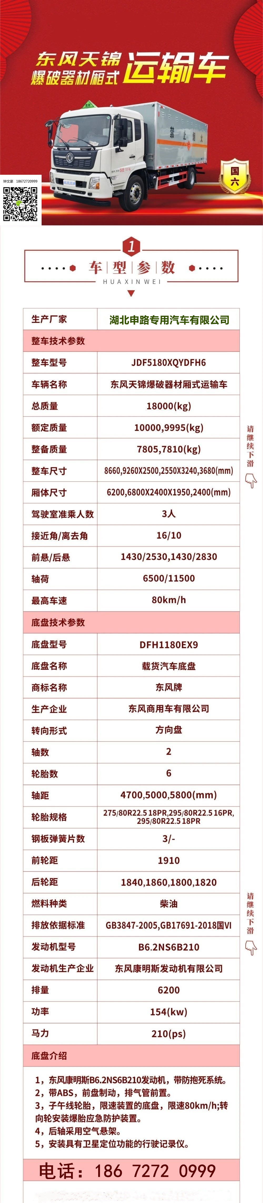 产品特点:东风天锦9.99吨国六炸药运输车符合国六新法规,整车不超重,全国上牌无忧